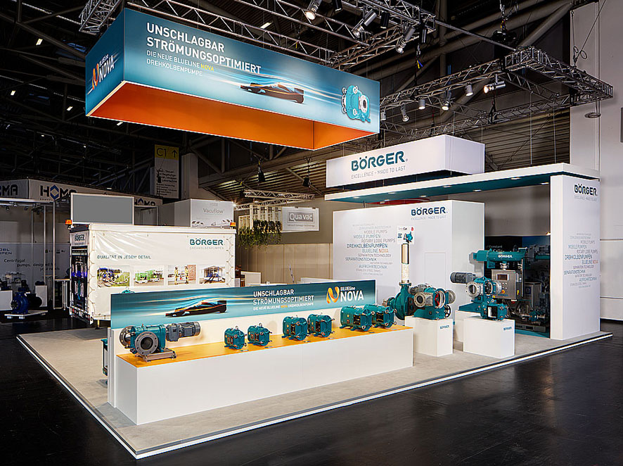 Überall, wo Pumpen benötigt werden, ist Börger zu finden. Die klare Präsenz der Börger-Pumpen am Markt findet sich im Messekonzept wieder.